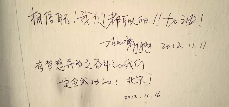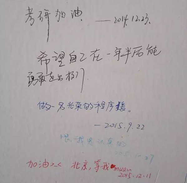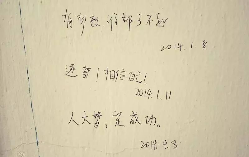 考研路上还有一群相伴的人或许你们并不熟识但是你们都有共同的目标——上岸 在校园里有一些安静的角落似乎只有你们知道在那里你或许只是寻觅一方清净背书也或许是忙里偷闲放空自己还或许是心态崩溃想要冷静在角落的墙上你们偷偷写下心中的目标为彼此加油给自己打气