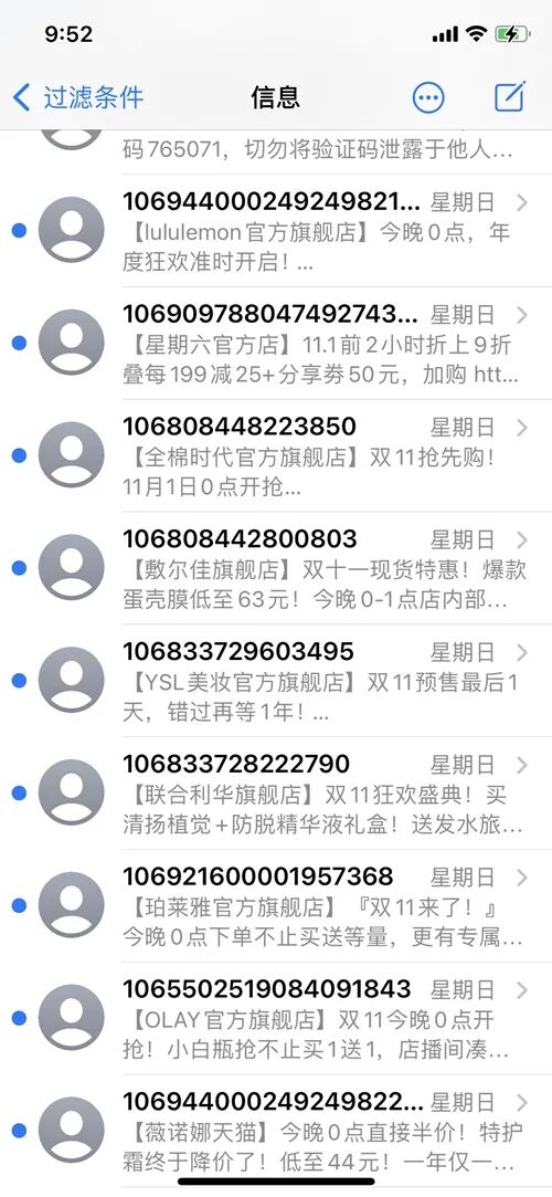10月31日当天,消费者收到大量“双11”相关的营销短信。受访用户供图。 据介绍,近年来,“双11”促销期间的营销类垃圾短信投诉呈现集中爆发现象,电商平台的相关投诉占比高达九成,且衍生出大量相关消费金融类垃圾信息投诉。 此前,工业和信息化部信息通信管理局聚焦人民群众反映强烈的营销短信扰民问题召开行政指导会,规范电商平台短信营销行为。要求主要电商平台要正视存在的问题,承担起平台生态治理的主体责任。 不过,据多名消费者反映,今年“双11”营销短信一点也不见少。“原以为今年‘双11’营销短信会有所收敛,但部分商家几乎每天都给我发一条营销短信。”有消费者对中新网记者表示。