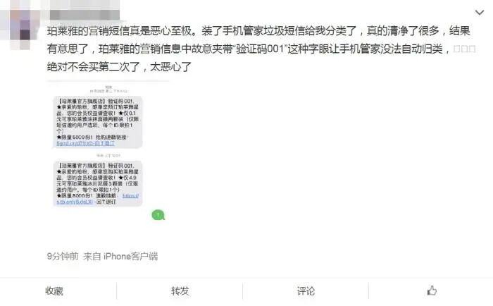 据网友反映,部分商家营销短信内容夹带“验证码001”等关键字眼规避手机管家拦截。微博截图 另外,道高一尺魔高一丈,据网友反映,现在部分商家的营销短信故意夹带“验证码001”这种字眼让手机管家没法自动归类进行拦截,防不胜防。 据了解,目前手机短信一个主要服务是用来收验证码,一般情况下,相关软件会对这样的营销短信识别为“验证码”短信,不会对其拦截。这被一些不良商家利用。 未经用户允许不得发营销短信 记者注意到,不少消费者之所以收到营销短信,除了“双11”是促销节点外,或还因为曾购买过该网店产品,电话号码等个人信息被记录了下来。 实际上,这种情况也是不被允许的。工信部指出,特别是平台“默认”注册用户同意直接发送促销信息,平台商家利用平台规则漏洞发送营销短信等问题较为突出,明显侵害消费者权益。 工信部还要求,不得未经消费者同意或请求擅自发送营销短信,完善现有短信营销预案。 但记者在多个电商APP平台查看,没有如何取消这种营销短信的设置,只是在一些营销短信最后提醒“TD退订”“回T退”“回t取关”等。 “咱也没办法,也不敢回复TD,怕中了‘连环计’。”不少消费者对这种方式难以接受。实际上,这样的担心是有必要的,时常就有回复“TD”反而上当的案例被媒体曝光。 “无论你回复什么,营销短信该发还是发,有回复后,商家反而容易判断这是一个真实的用户。”记者试验对部分营销短信回复“TD”退订,但并无后续。 有分析称,有时候营销短信末尾加一段退订提醒,目的并不是方便用户退订,而是诱导用户回复这条短信。你知道了吗?