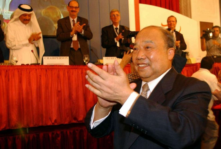 ↑2001年11月10日,在卡塔尔首都多哈,世界贸易组织第四届部长级会议审议并通过中国加入世贸组织的决定后,时任中国政府代表团团长、外经贸部部长石广生与其他与会者鼓掌庆贺。新华社记者 王建华 摄