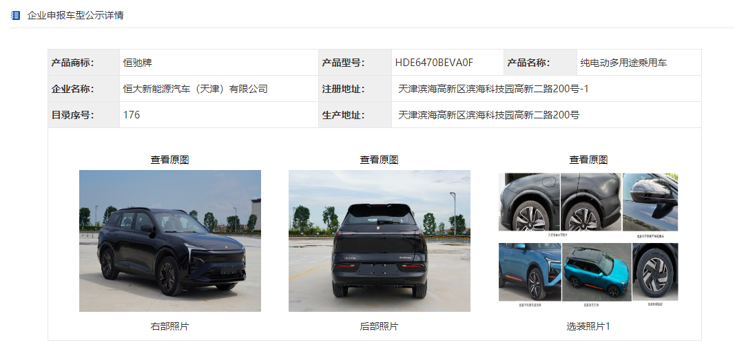 11月9日,工信部网站发布第350批《道路机动车辆生产企业及产品公告》新产品公示,其中,恒大新能源汽车(天津)有限公司申报了恒驰牌纯电动多用途乘用车,型号为HDE6470BEVA1F、HDE6470BEVA0F。