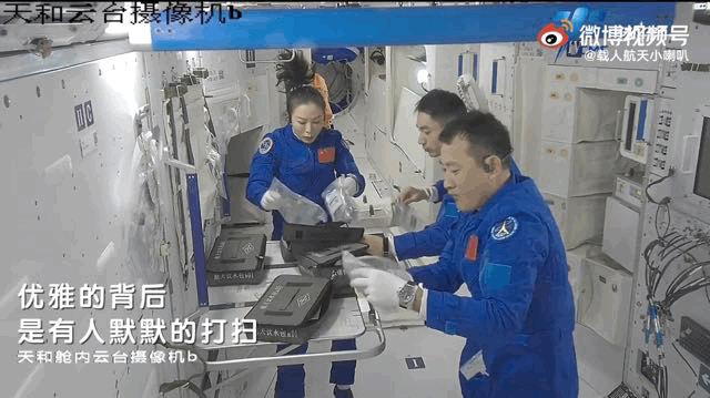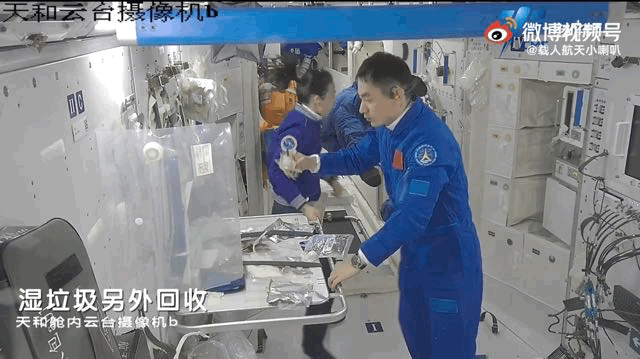 三位航天员对厨余垃圾进行了分类处理食品包装袋要放到专门的大袋子里↓