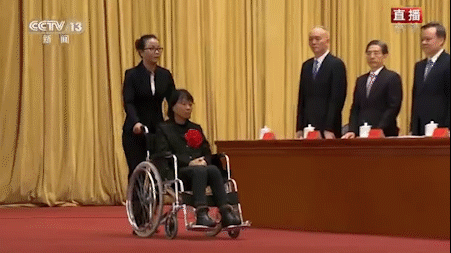 她坐着轮椅接受表彰