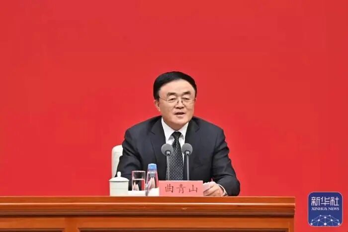 中央党史和文献研究院院长曲青山回答记者提问。图片来源:新华社