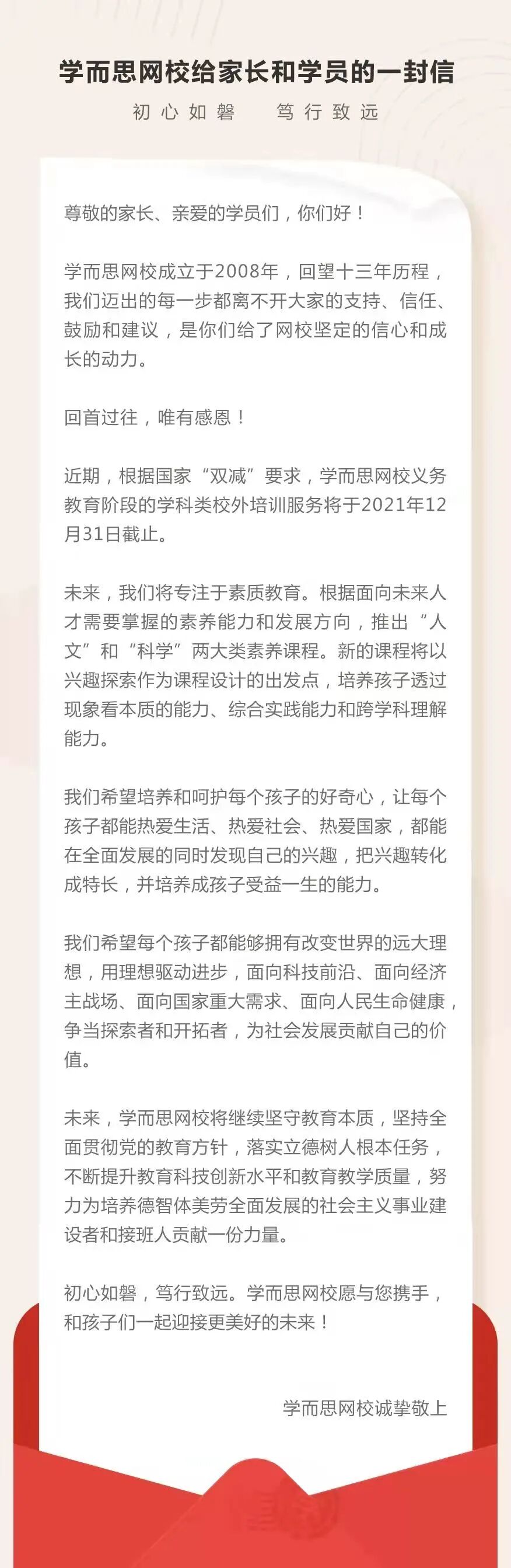 13日上午,学而思公众号推送一篇文章《致学而思培优家长和孩子的一封信》,以下为全文↓