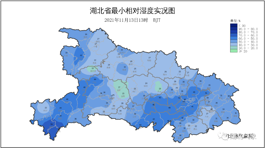 最小相对湿度在30%左右中西部局地甚至不足20%大家要注意防秋燥,多补水更要注意用火用电安全谨防各类火灾发生