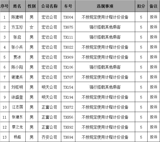 对上黑榜驾驶员提出批评,希望他们规范经营,文明服务,进一步提升服务水平,加油!