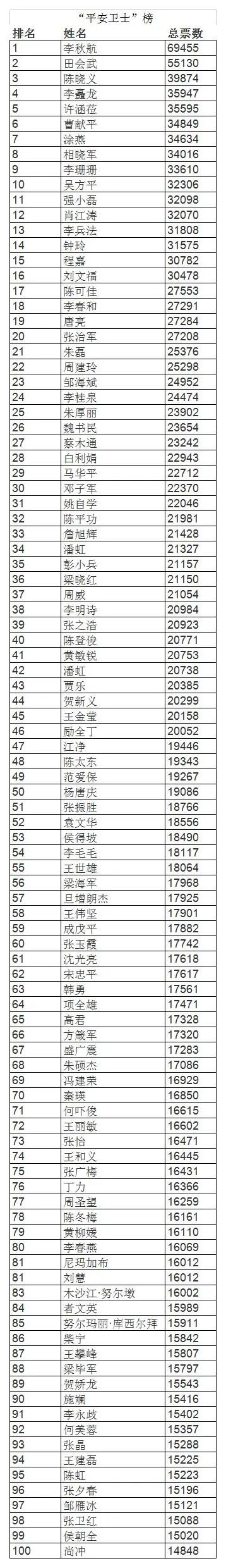 “平安卫士”前100名榜单(数据截至12日20时)
