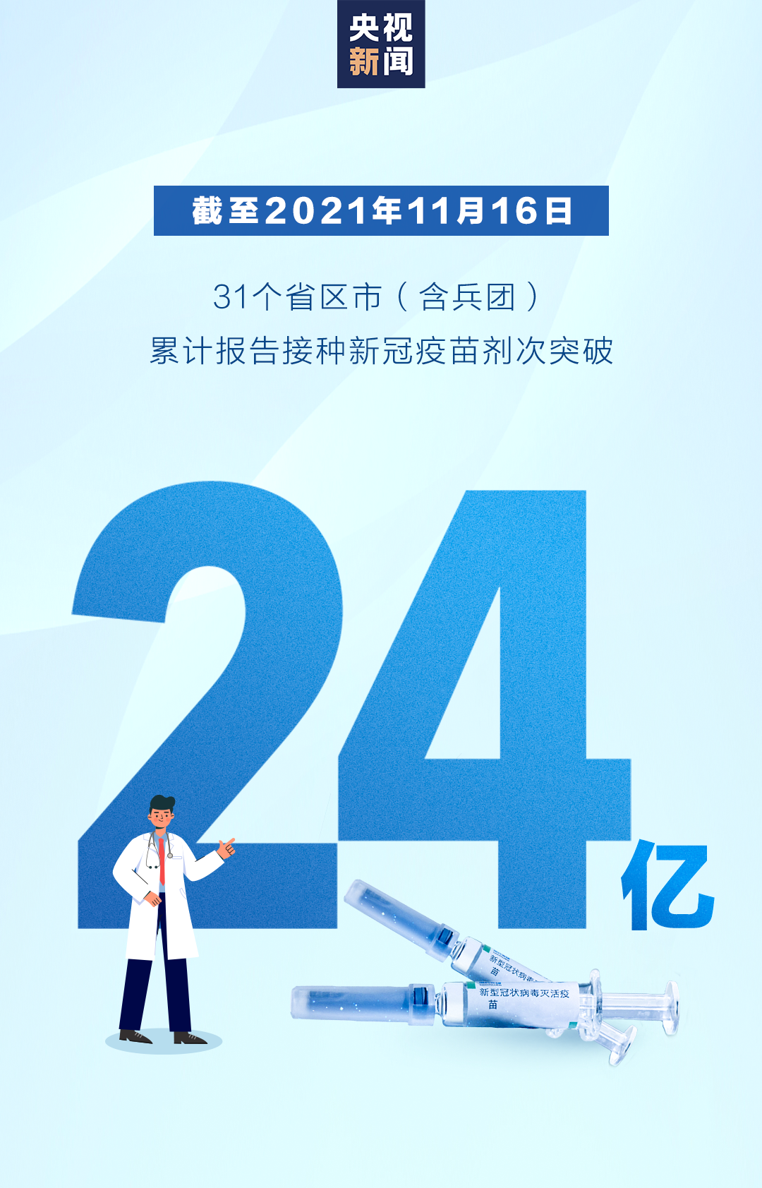 截至11月16日,31个省(自治区、直辖市)和新疆生产建设兵团累计报告接种新冠病毒疫苗240289.7万剂次。