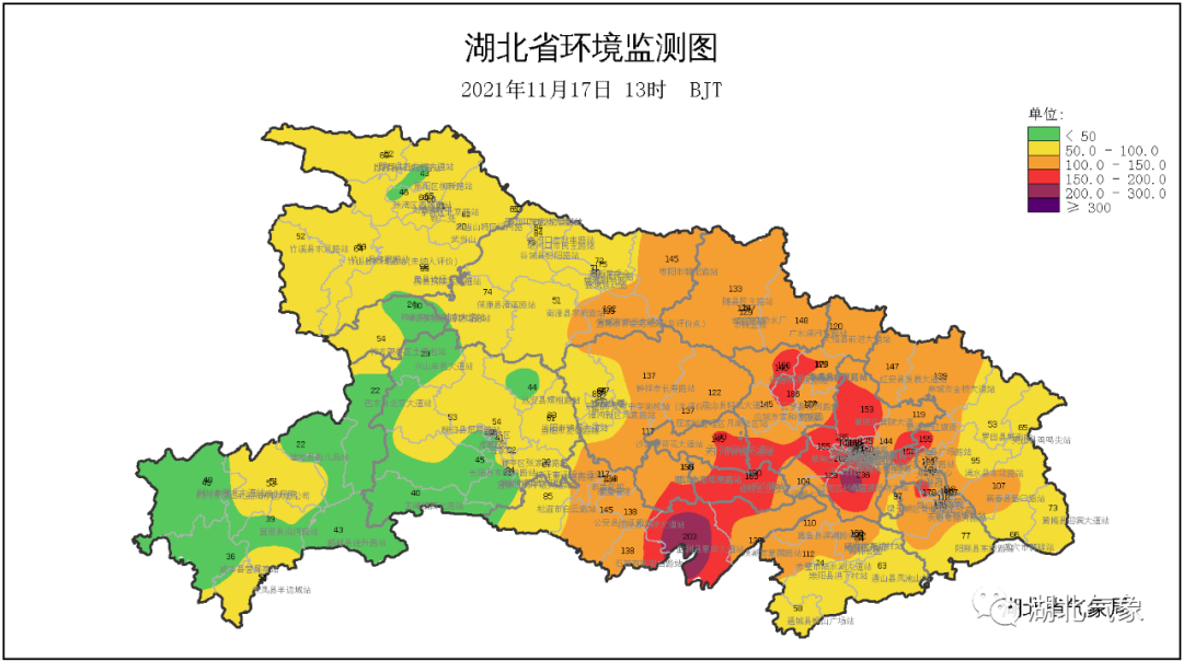 今天早上天空比较阴沉,同时伴有霾、雾的发生,从环境监测数据看,襄阳、荆门、仙桃、武汉等地出现中度污染,其中局部地区达到重度污染,气温方面,最低气温鄂西大部地区6~11℃,其他地区12~15℃。