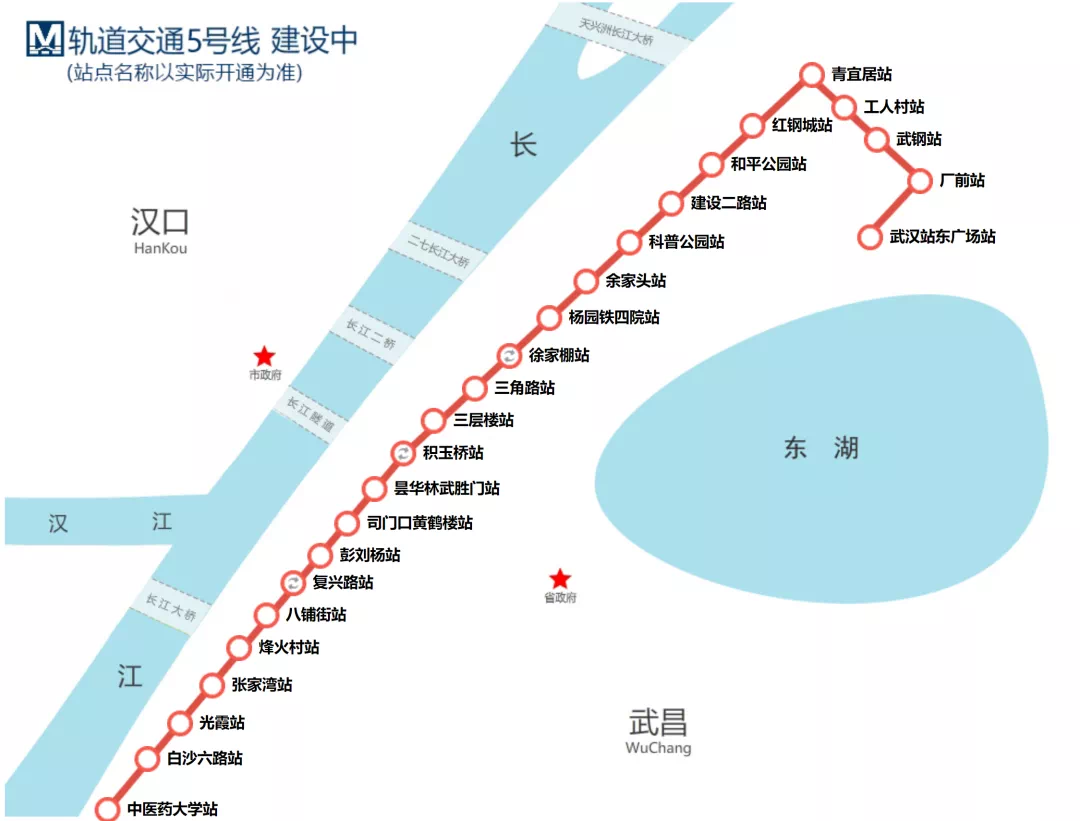 (一)轨道交通5号线:由武汉火车站至青菱南三环,全长35.2公里,设站25座。目前,车站主体结构已全部完工,区间已贯通;出入口共98个,已完工88个,6个在建,1个未开工,3个缓建;风亭共55组,已完工50组,在建3组,2组缓建;正进行空载试运行工作。