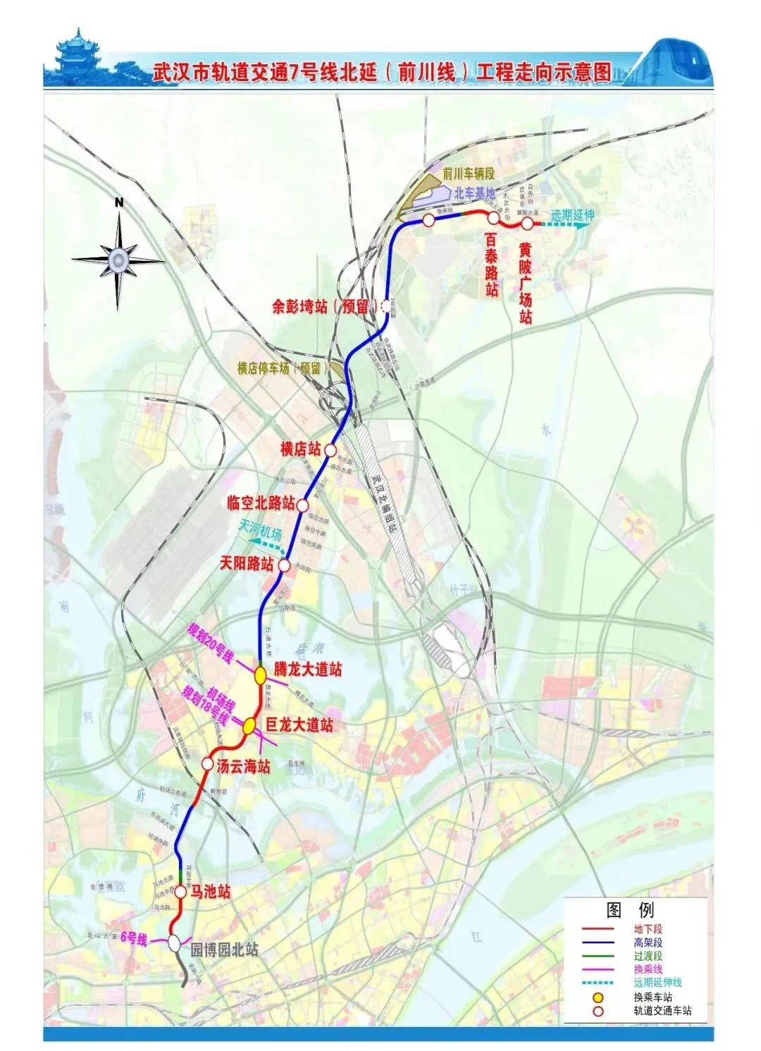 图源:武汉地铁微信公众号(四)轨道交通7号线北延(前川线):由马池路至前川北车基地,全长36.5公里,设站11座。4站主体结构已完工,7站正进行主体结构施工。共15个单线盾构区间,2个已贯通,10个正在掘进,3个未开工;共7个高架区间,正进行上部结构施工。北车基地站基础结构完工、天阳路站基础结构完工2个节点目标已完成。