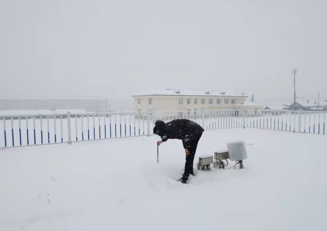 11月21日21时,黑龙江省丰林县自南向北出现降雪,截至23日8时,累计降雪量19毫米,积雪深入36厘米。图为气象工作人员正在测量积雪深度。王超 摄