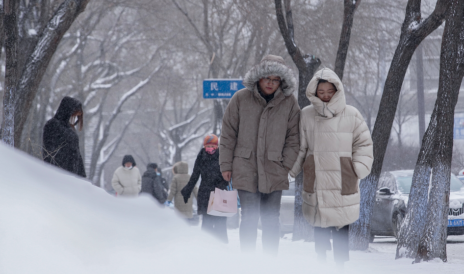 11月22日,在黑龙江省哈尔滨市,市民在雪中穿行。吕国君 摄