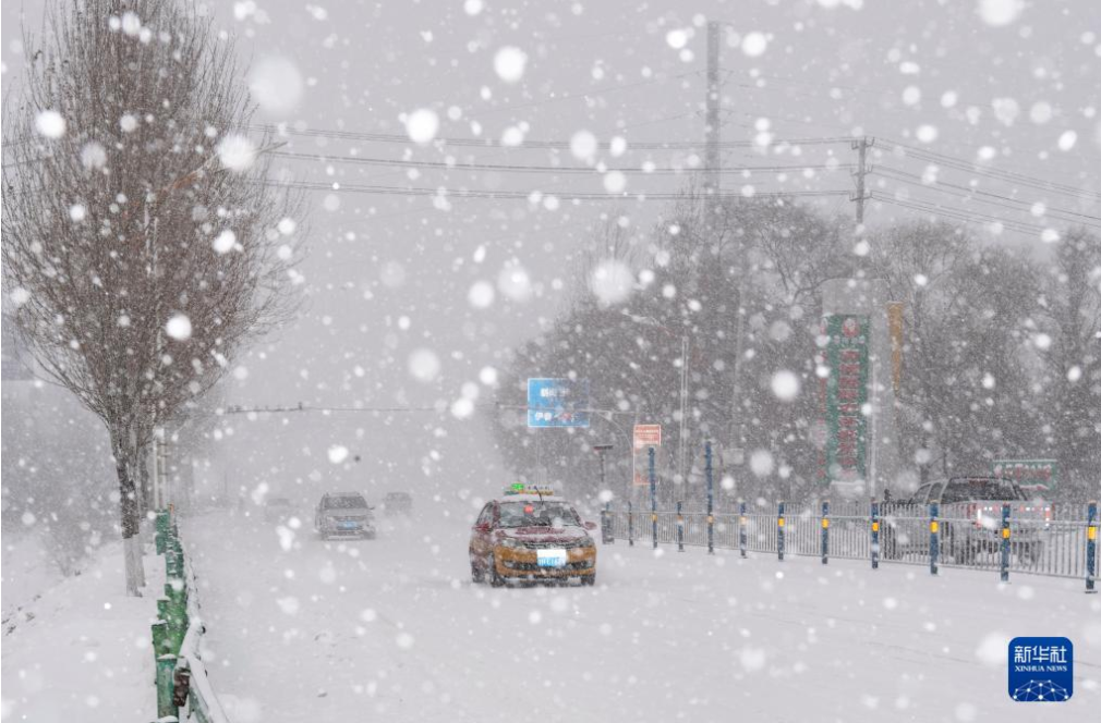 11月22日,出租车行驶在暴雪中的黑龙江省鹤岗市街头。新华社记者 谢剑飞 摄