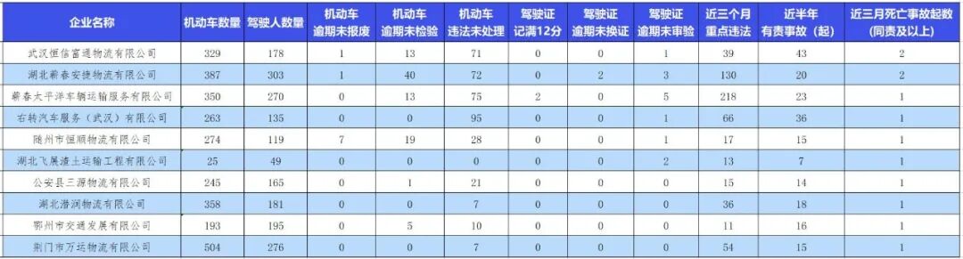 风险情况根据企业名下机动车和驾驶人的登记管理、交通违法、交通事故等多维度信息进行交通安全风险评估,重点违法指超速、超员、超载、疲劳驾驶、酒驾醉驾、逾期未检验车辆上道路行驶、逾期未报废车辆上道路行驶,客车凌晨2时至5时违规运行,货车闯红灯、货车违法载人,危化品运输车辆高速违法停车、危化品运输车辆违反禁限行规定等重点违法行为。