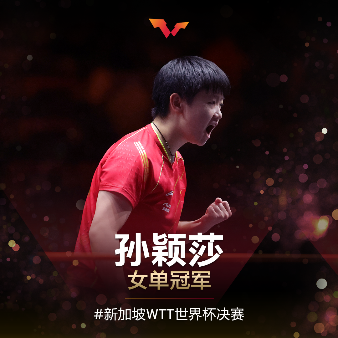 恭喜!孙颖莎、樊振东,双双夺冠! 2021-12-08 09:24 0 12月7日,WTT世界杯决赛在新加坡进行最后争夺。女单决赛中,孙颖莎4比2战胜队友王艺迪,夺得冠军。男单决赛中,樊振东4比1战胜日本队选手张本智和,夺得冠军。 恭喜孙颖莎! 恭喜樊振东! 来源:人民日报
