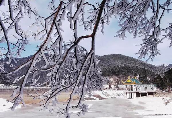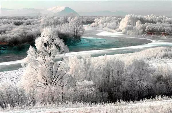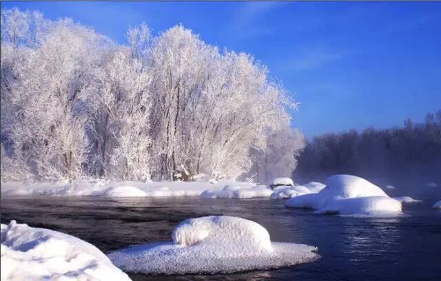 雾凇岛是松花江上的一座小岛,这里因雾凇多且美丽而得名,冬日里不冻的江水腾起来的水雾,遇到寒冷的空气,在树上凝结为霜花,玉树琼枝,分外迷人。