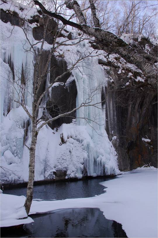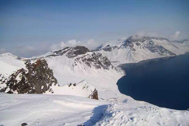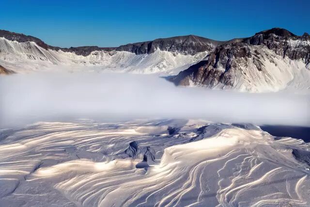 柔美的天池被披覆白雪的群峰环抱,蔚为壮观,天池湖水清澈碧透,一平如镜,寒冷的冬日仿佛凝固了时间,更为天池增添了一抹神秘的风韵。