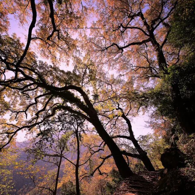 古老的枫树高大而挺拔,透过层层叠叠的红叶,细碎的阳光洒落在条石铺就的山径上,行走其间,宛如漫步在红霞之中。