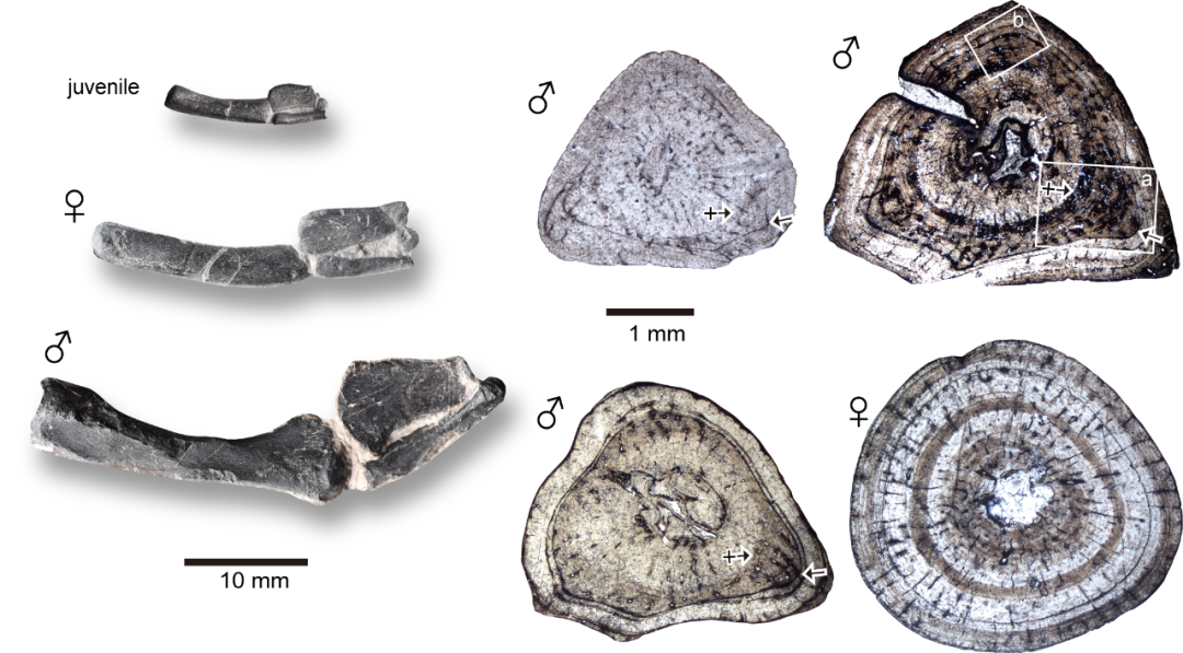 通过对比幼年个体、青春期个体及成年个体骨组织,分析骨密度和生长速率,研究团队得出了贵州龙在青春期快速生长的结论,获得了贵州龙青春期发育开始和终止的信息:青春期雄性个体的肱骨逐渐形成了三角形中轴截面,而雌性和幼年个体肱骨中轴截面一直保持椭圆形。