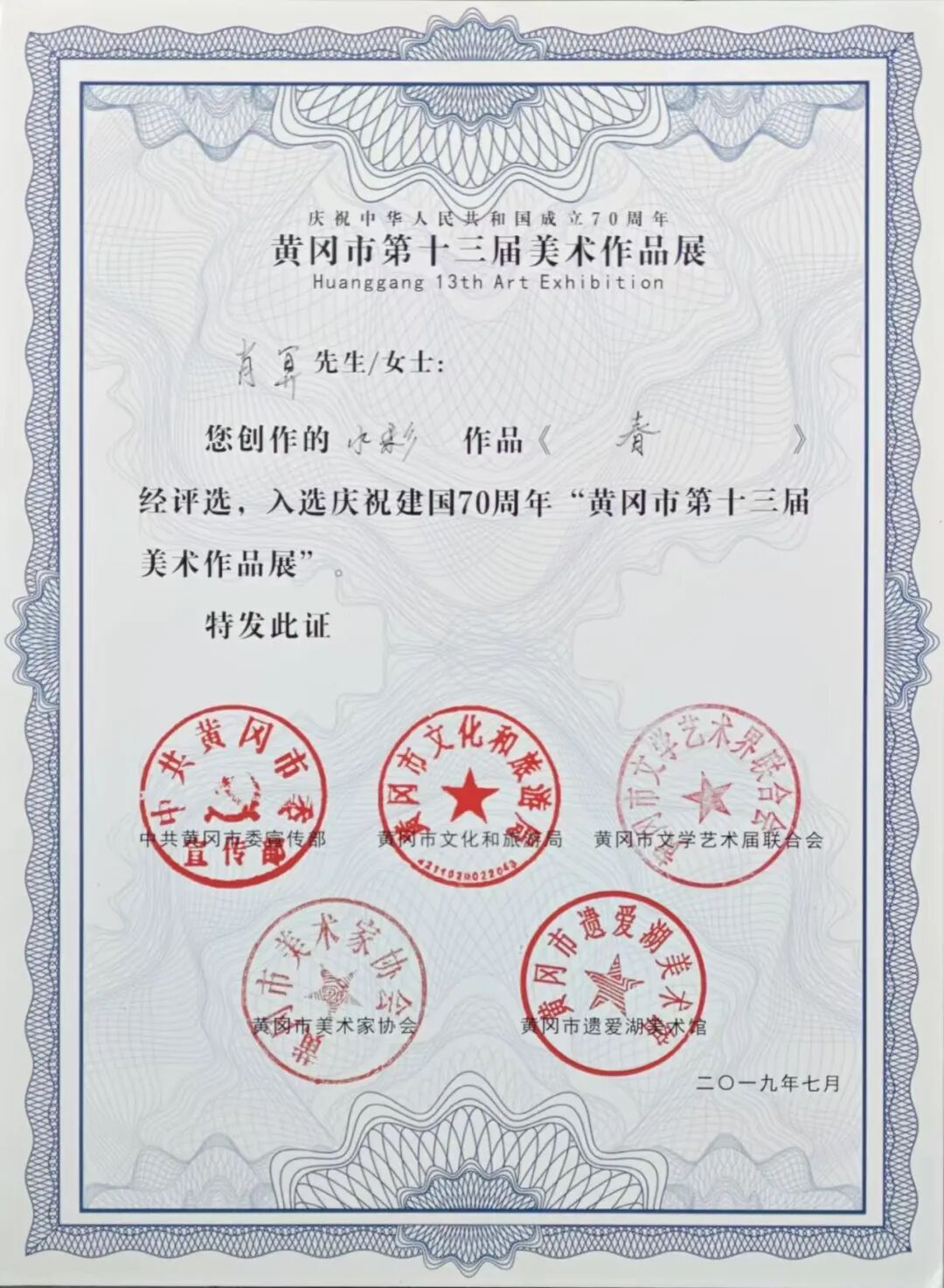 2019年《春》《军民情深》等作品入选黄冈市美术家协会举办的庆祝建国70周年作品展