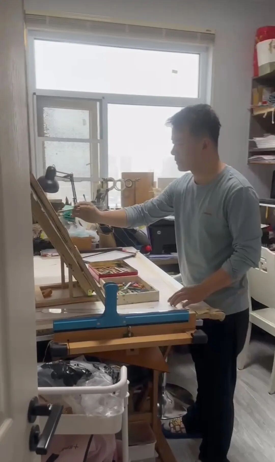 清晨的蕲春,薄雾氤氲,家家户户门楣上新挂的艾草还缀着晶莹的露珠,满城艾香气无声流淌在石板巷弄间。而在实验中学教师肖算老师家中一间仅有6平米的旧画室里,另一种沉郁而浓郁的“香”已默默积蕴了17个寒暑春秋——那是松节油与梦想发酵的味道,是小镇青年用一支支秃笔、一夜夜星斗熬出的岁月沉香。