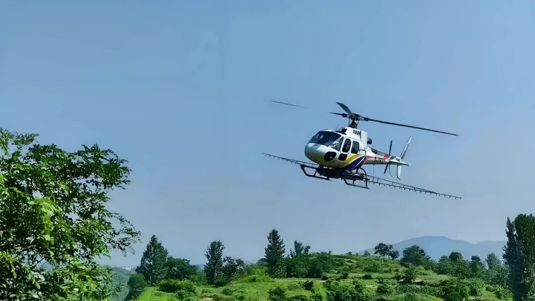 6月3日,记者在凤山镇、河铺镇等地飞防作业现场看到,直升机搭载药剂盘旋升空,对成片板栗林实施精准喷防。此次大规模防治行动旨在有效防治板栗剪枝象虫害蔓延,为全县板栗产业稳产增收筑牢屏障。