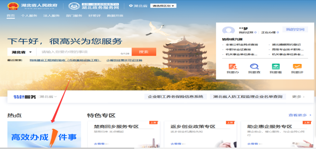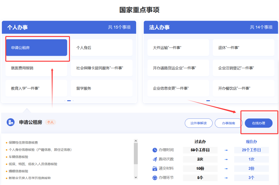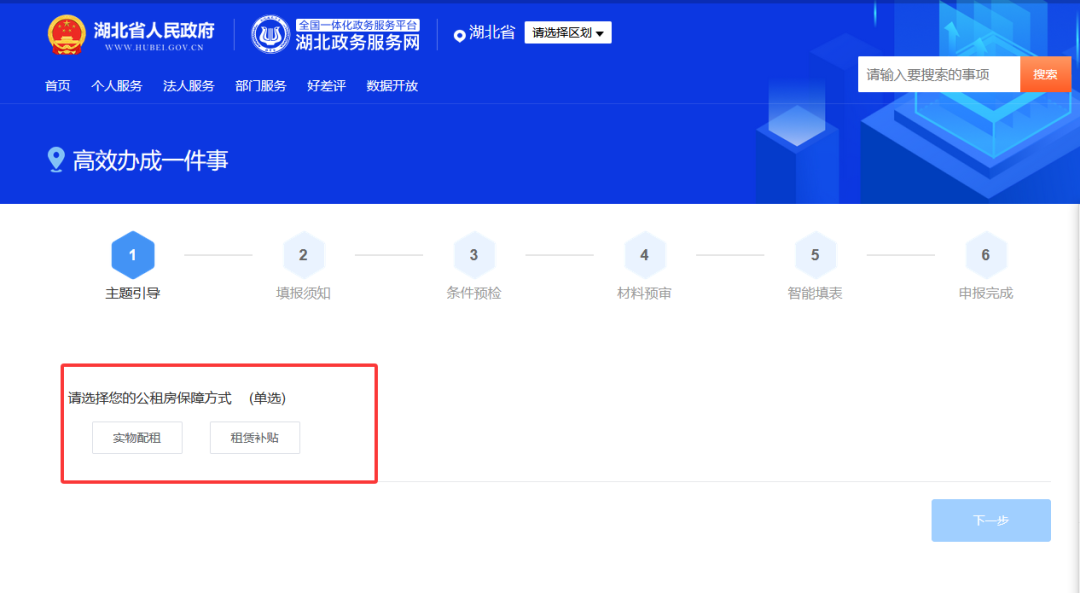 1.登录湖北政务服务网→从高效办成一件事板块进入,国家重点事项里面找到申请公租房、点击在线办理