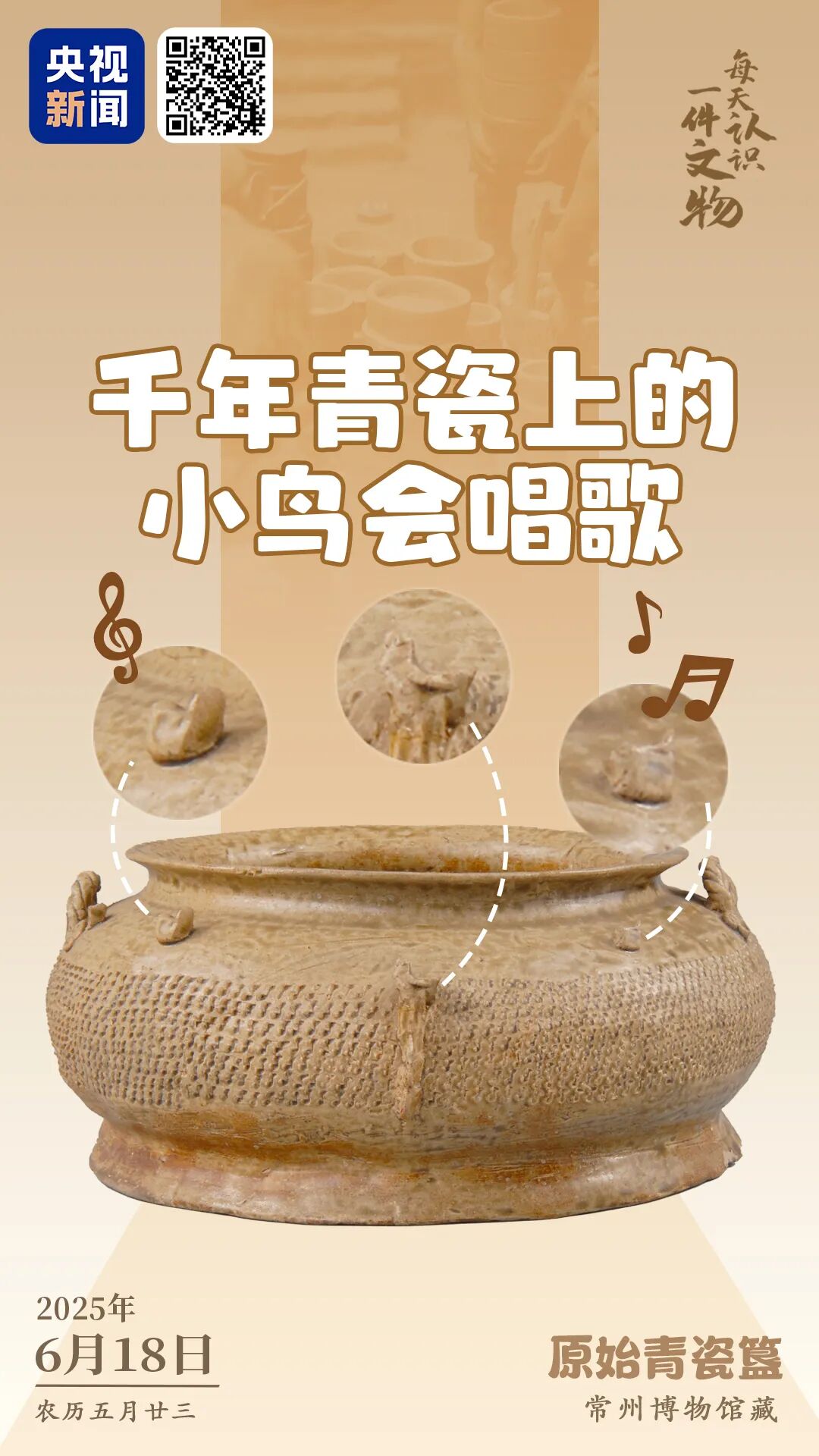央视新闻联合全国博物馆推出文博科普产品《文博日历》,每天带你认识一件文物。原始青瓷簋(guǐ),来自春秋时期。簋,是古人祭祀时盛放稻、粱、黍等食品的器具。这件青瓷簋的器身贴塑了多只小鸟,它们伸长脖子、挺起胸脯、翘起尾巴,形态生动。