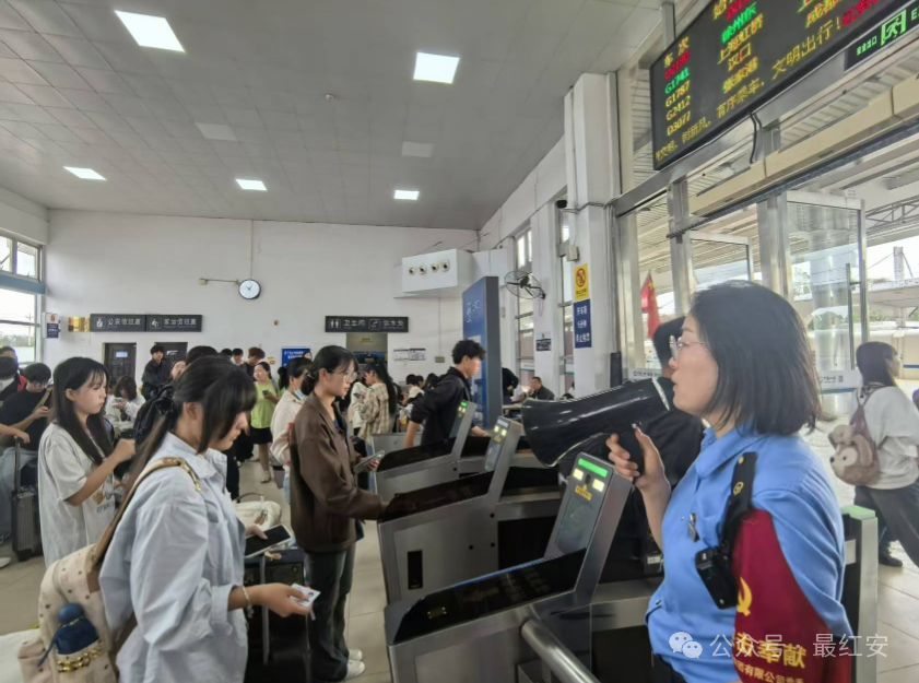 站前广场上,一面面五星红旗迎风招展,尽显节日氛围;候车室内,火红的中国结在阳光下熠熠生辉,与旅客们的笑脸交相辉映,构成一幅温馨的画面。