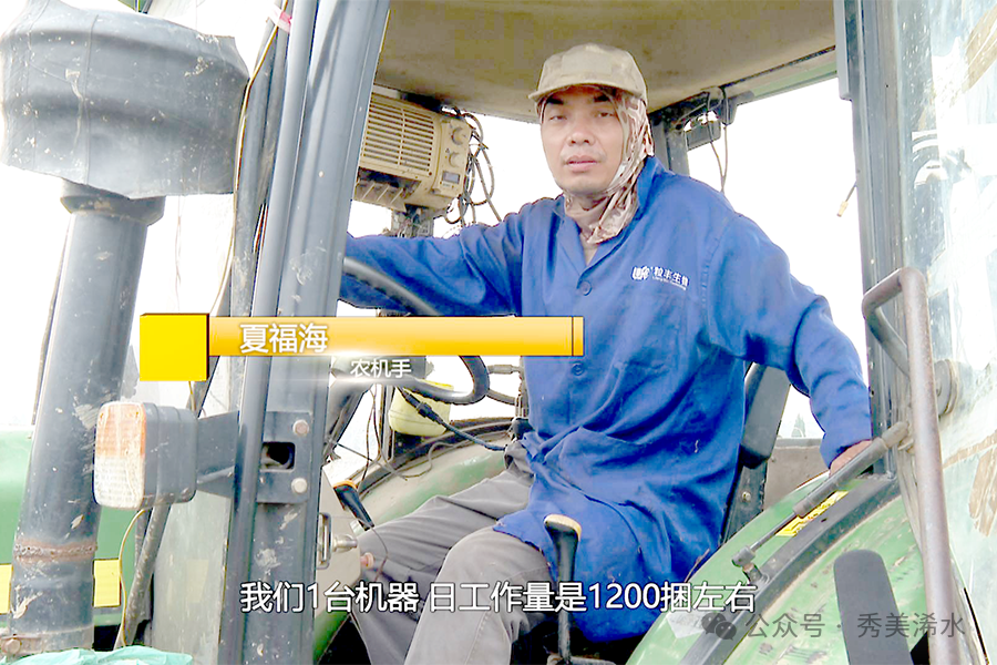 农机手 夏福海:1台机器日工作量1200捆左右,重量约21吨;1台机器日作业面积70亩,总面积16000亩,大概20天左右打捆作业全部结束。
