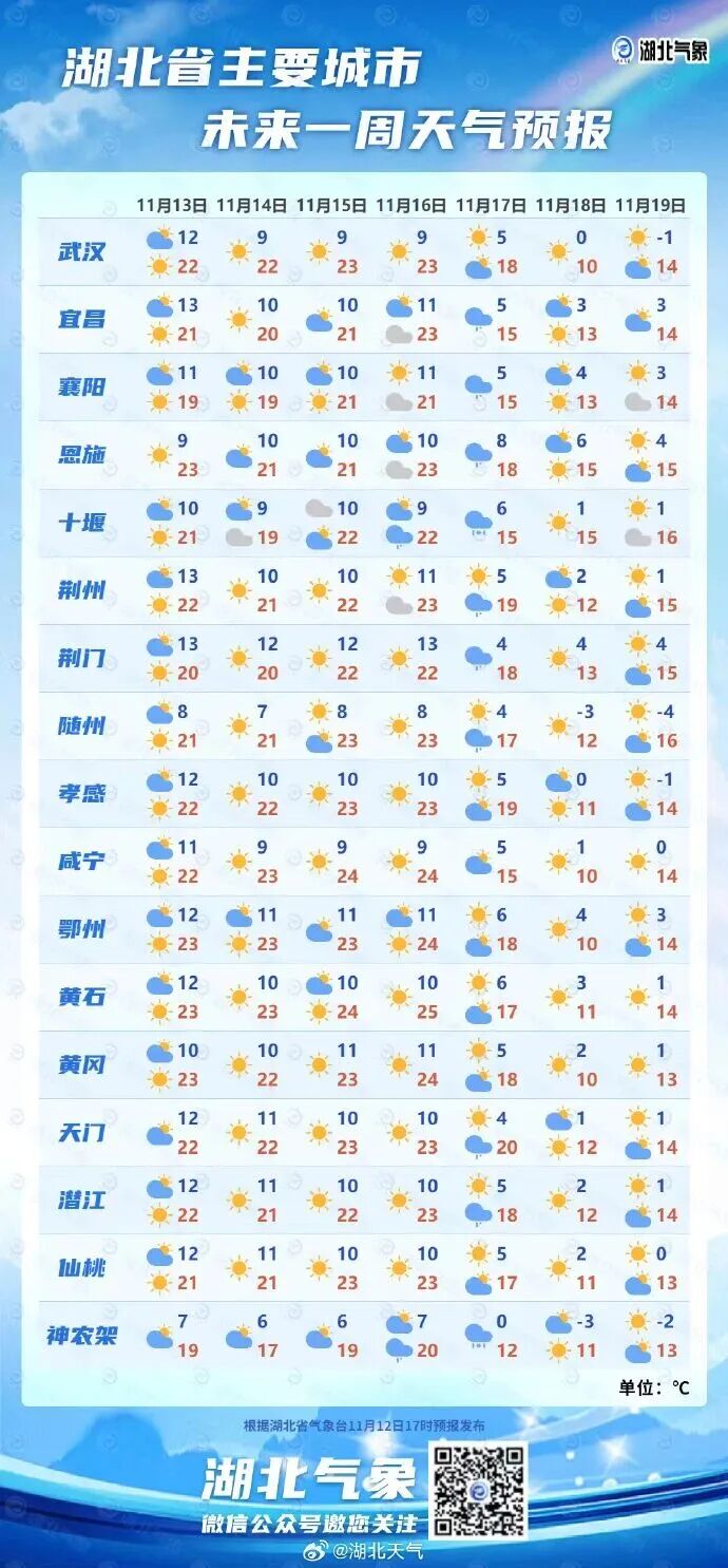 预计未来两天,湖北省仍将维持晴或多云天气,气温小幅上升,大部地区最高气温20~25℃。11月16日至11月17日,将有新一股强冷空气来袭,全省将会迎来一次大风降温和降水的天气过程。11月19日,黄冈最低温降至1℃。