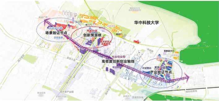 与华中科技大学校园从最西到最东相对应,在校园对面、珞喻路南侧,从武汉市光谷广场到关东工业园,将建设约4公里长的“环华科大创新发展带”,打造世界级科创街区。