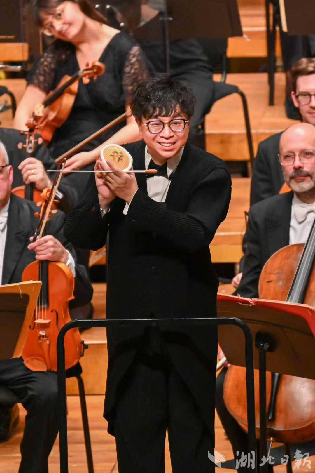 演出尾声,黄佳俊手持热干面玩偶向观众致意,引发全场雷鸣般的掌声。这位曾于2017年在武汉一天连吃四碗热干面的指挥家介绍:“武汉这座城市的独特魅力让我难忘,琴台‘知音’文化所传递的温暖与音乐的力量不谋而合。”