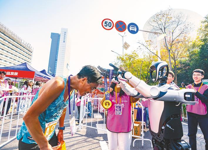 光谷马拉松终点处,人形机器人为完赛者戴上奖牌。 (湖北日报全媒记者 魏铼 通讯员 张璨龙 摄)
