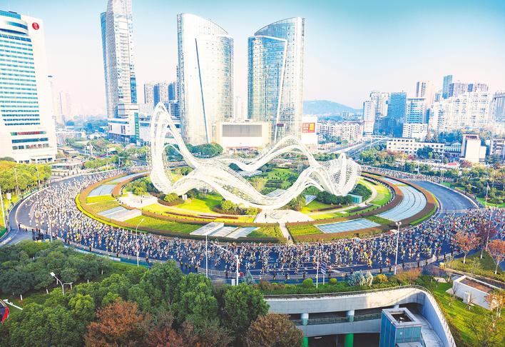 11月16日上午,华工科技2025光谷马拉松在武汉东湖高新区鸣枪开跑,参赛选手跑过光谷星河广场。(湖北日报全媒记者 柯皓 摄)