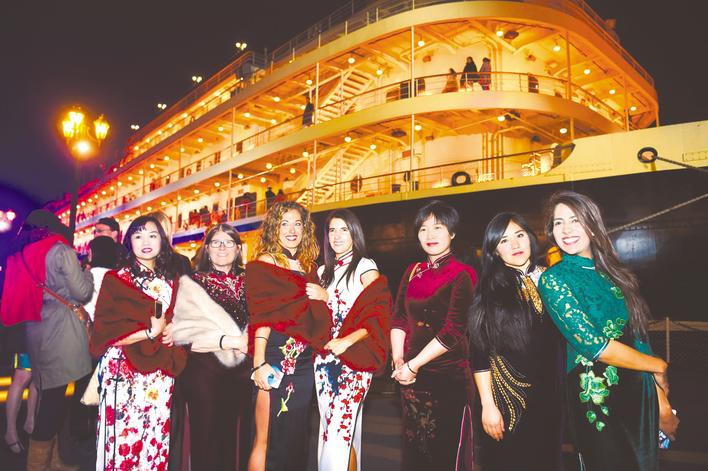 外国友人夜游长江,与“知音号”合影。(本报资料图片)