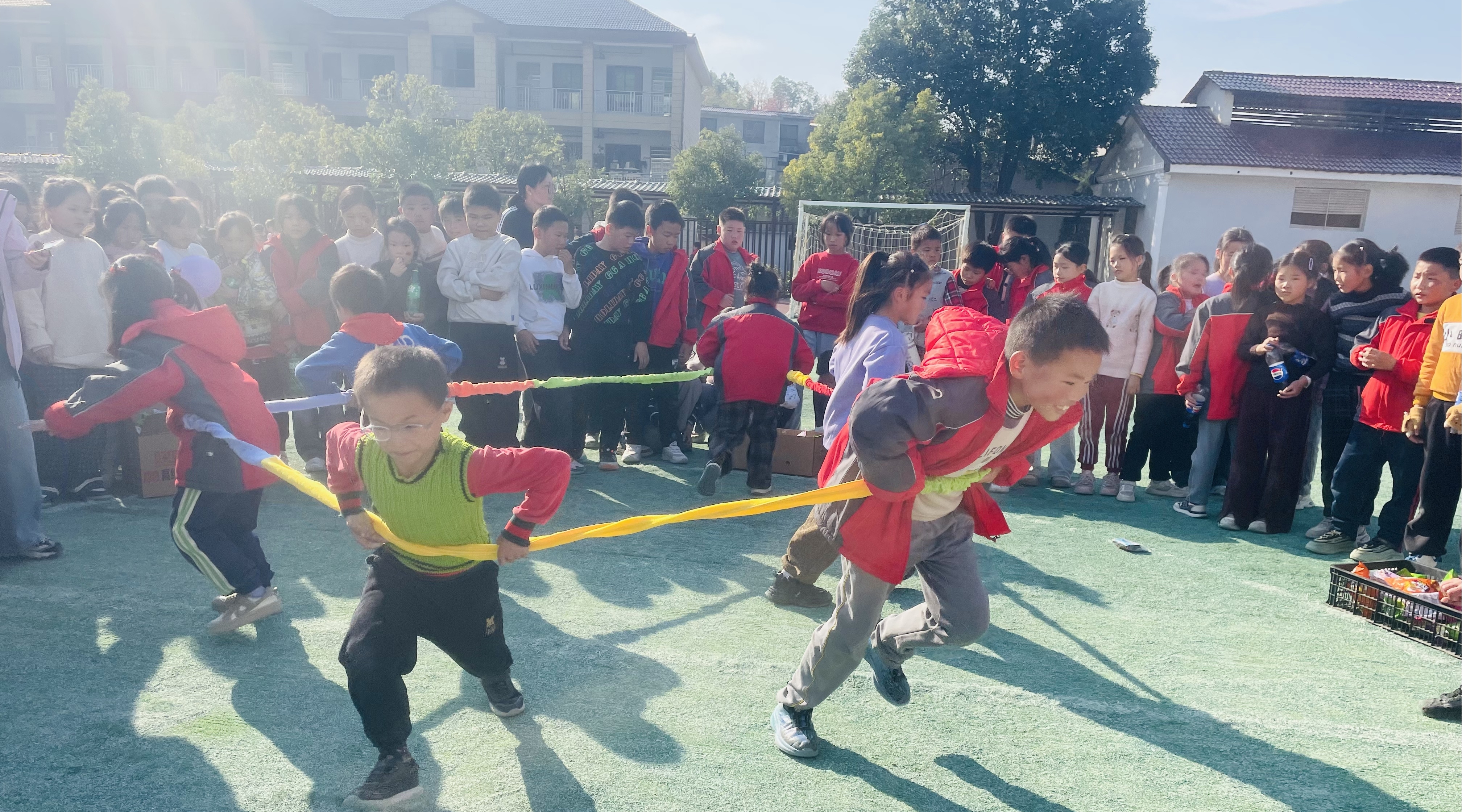 赛场好戏连台:一、二年级 “小飞人” 冲 40 米、甩跳绳;三、四年级拼 200 米、比立定跳远;五年级扛 800 米、赛跳远。团体赛更欢乐,拔河、跳绳超热血,两人三足、“赶小猪”“套大鹅”“零食大作战” 逗得全场笑不停。