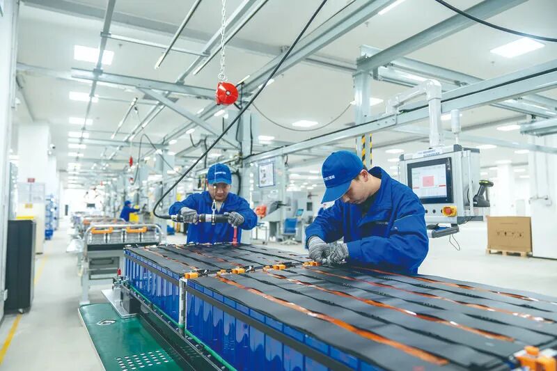 ▲11月19日,宜昌楚能新能源PACK车间内,工人正在赶制314Ah电池组成的PACK插箱。金晓燕 摄