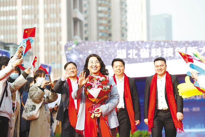 2023年3月16日,2023湖北省科技创新大会在武汉洪山礼堂举行,众多市民手持鲜花、挥舞国旗夹道欢迎。图为华中农业大学教授赵书红和团队走上红毯。(湖北日报全媒记者 何宇欣 摄)