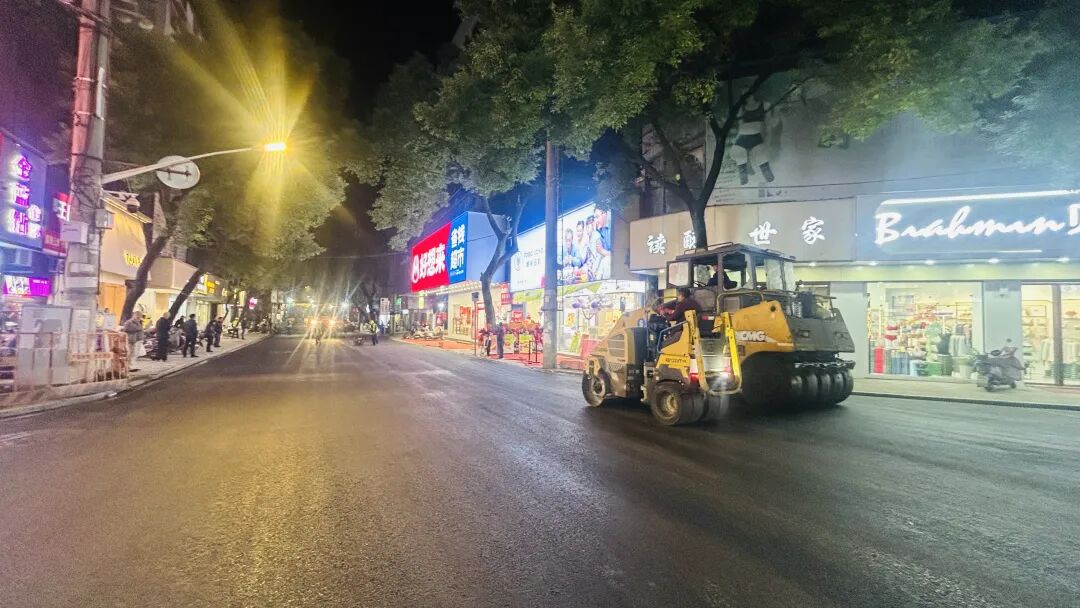 施工期间,施工单位充分利用夜间及交通低峰期,采取“错峰施工”模式,最大限度减少对商户经营和居民出行的影响。施工现场机械轰鸣、人员协作有序,沥青铺设、机械滚压等工序高效推进,展现出热火朝天的建设场景。