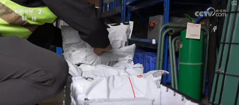 在深圳一家快递网点,快递员正忙碌地分拣包裹,部分包裹上被贴有“无人机”的标识。