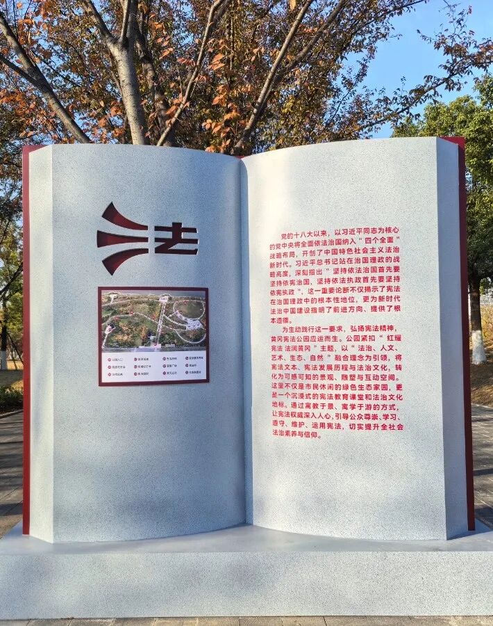 公园以“红耀宪法·法润黄冈”为主题,巧妙融合法治、人文、艺术、生态与自然元素。将宪法文本、宪法发展历程与法治文化深度融入景观之中,让市民漫步公园、享受自然之美的同时,感受到宪法的庄严与温度,真正实现“在休闲中学法”。