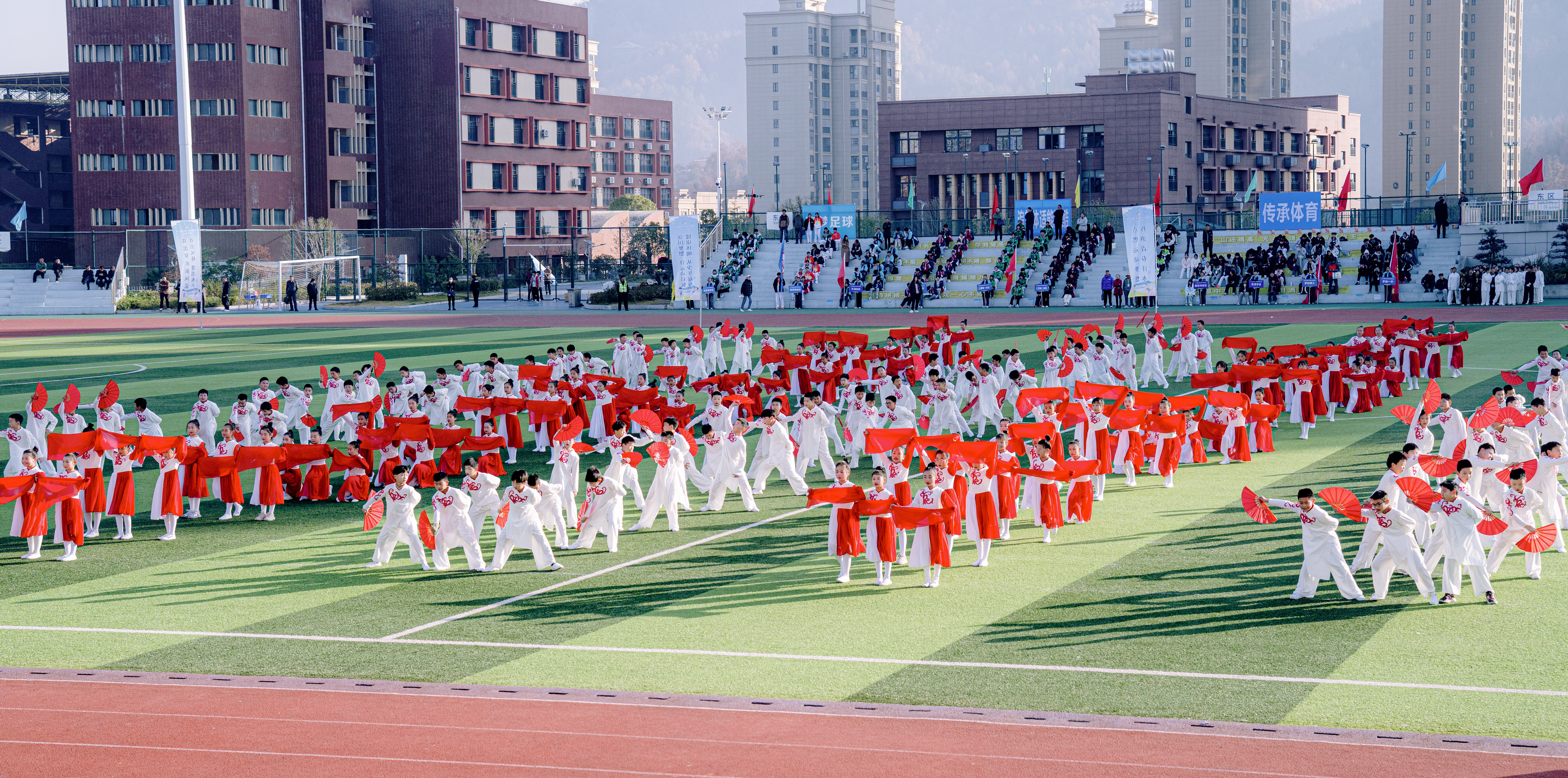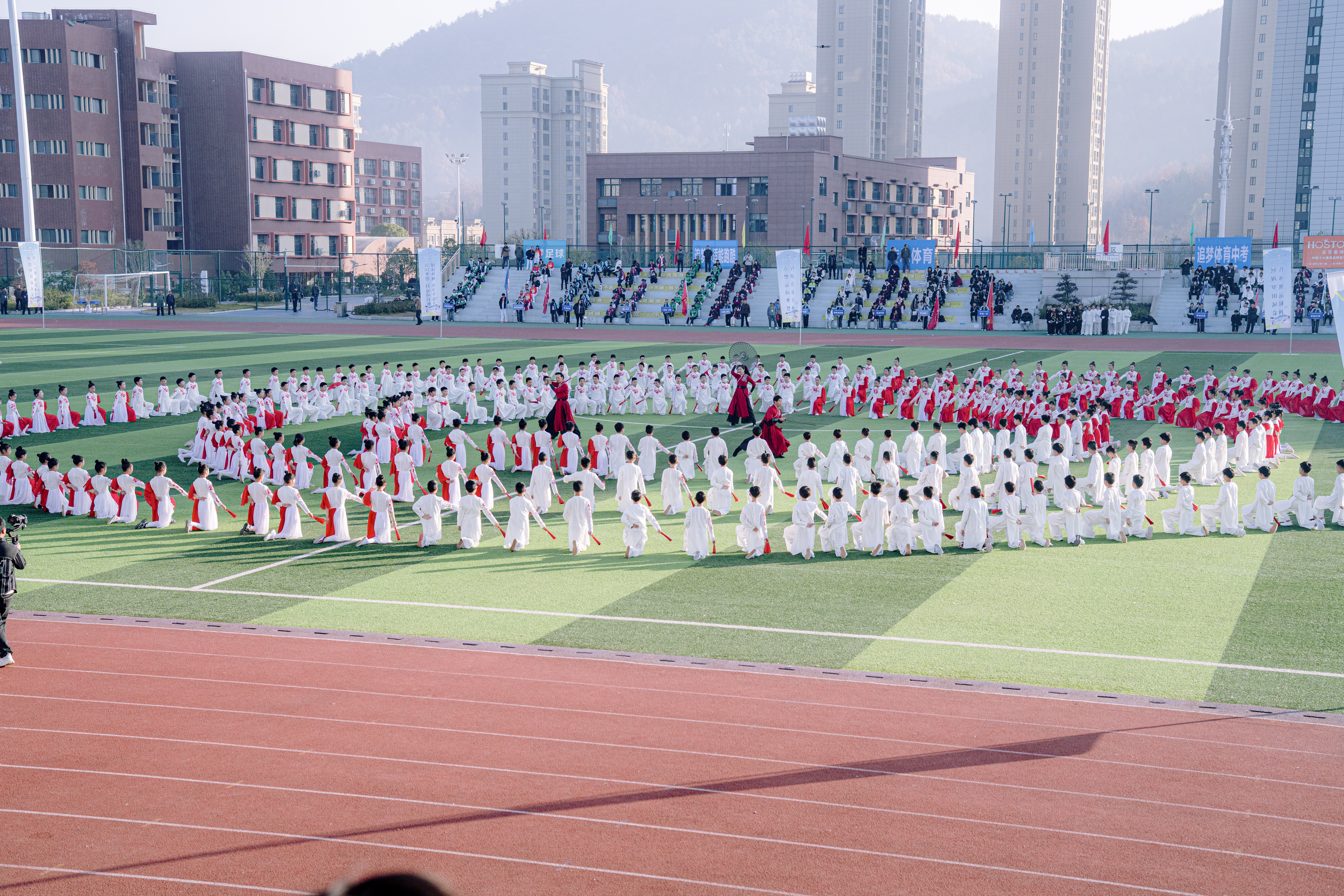 开幕式在精彩纷呈的团体操表演中拉开序幕。三所学校师生同台献艺,以多元艺术形式点燃了全场的激情。罗田县实验小学328名师生率先登场,献上大型团体操《龙腾梅绽,锦绣华章》。百年学府的底蕴与新时代少年的朝气交相辉映,水袖翩跹间流转戏曲古韵,拳脚生风处彰显武术精神,一场力与美的视觉盛宴,生动诠释着文化自信的当代传承。