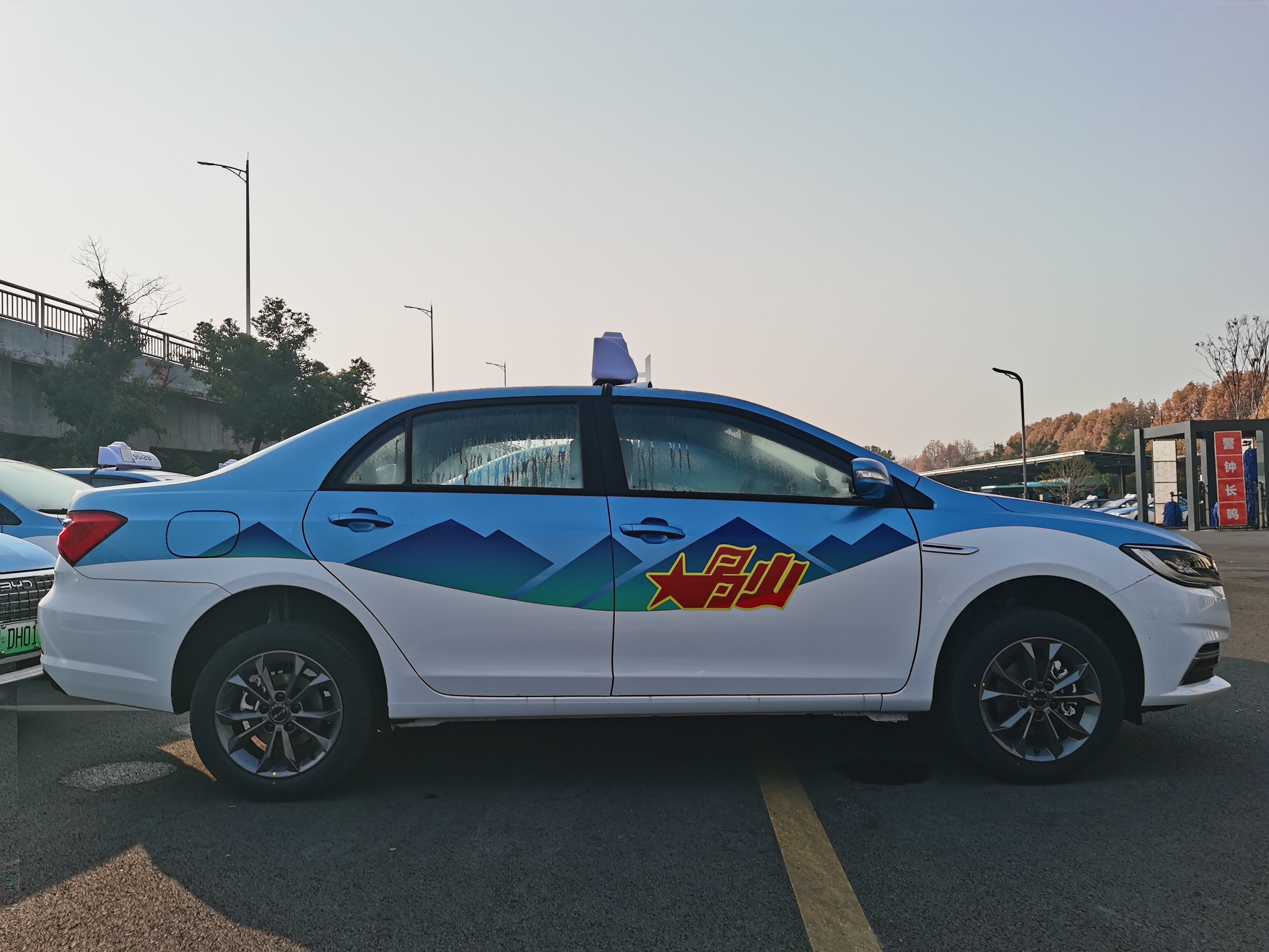 新车外观以大别山为核心设计脉络,将青绿色冈峦融入蓝天白云车身基底,勾勒“雄踞云海、蓝天之下”的山水意境,彰显天地正气;大别山LOGO巧融红星与山形,以红旗飘扬的视觉形态,凸显黄冈作为红色革命老区的基因底色,让巡游出租车成为流动的红色文化载体。自然山水与红色底蕴交织,让每一辆新能源巡游出租车成为黄冈文旅的移动名片,尽显城市独特魅力。