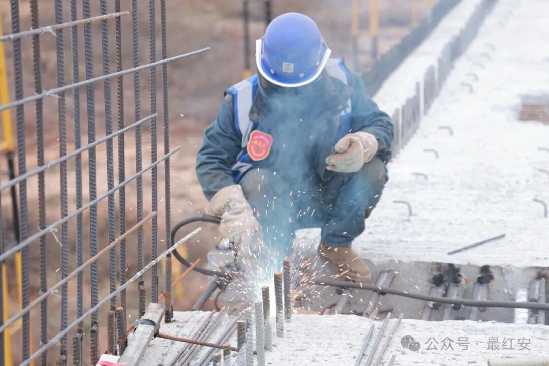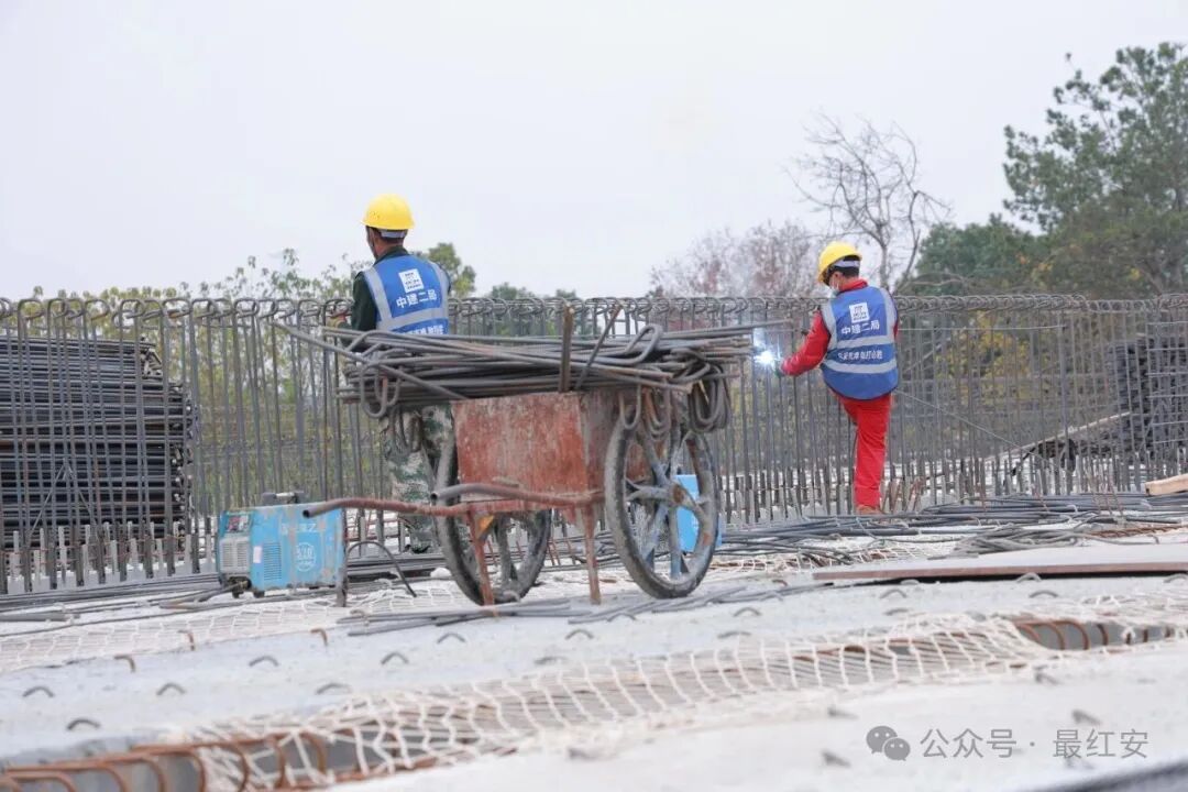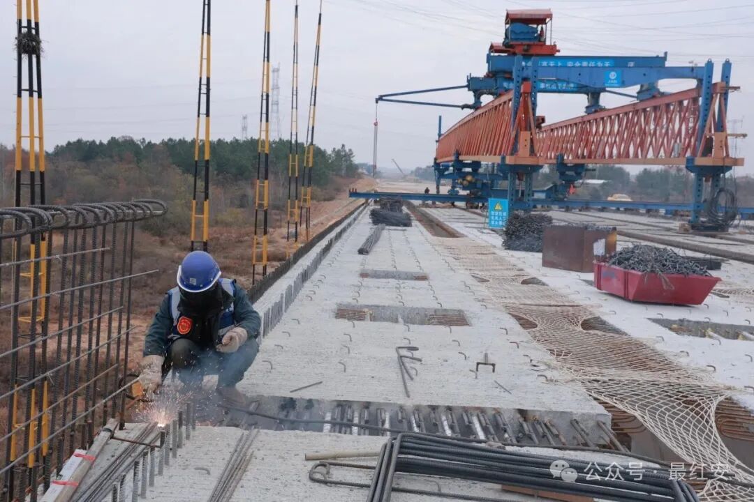 初冬的红安寒意渐浓,武汉都市圈环线黄陂至新洲段(红安段)项目现场却是一派火热,施工人员抢抓晴好天气加紧焊接作业,全力推进G230高架桥箱梁架设,各项工序高效有序。