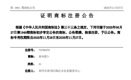 黄冈日报讯(记者孙志鹏 通讯员高水旺)11月28日,经国家知识产权局核准,“黄州萝卜”地理标志证明商标注册成功(注册号为:75796379),标志着黄州区地理标志保护与农产品品牌建设工作实现零的突破。这不仅是黄州萝卜产业从传统种植迈向品牌化、标准化发展的关键转折点,更为全区农业高质量发展写下浓墨重彩的一笔。