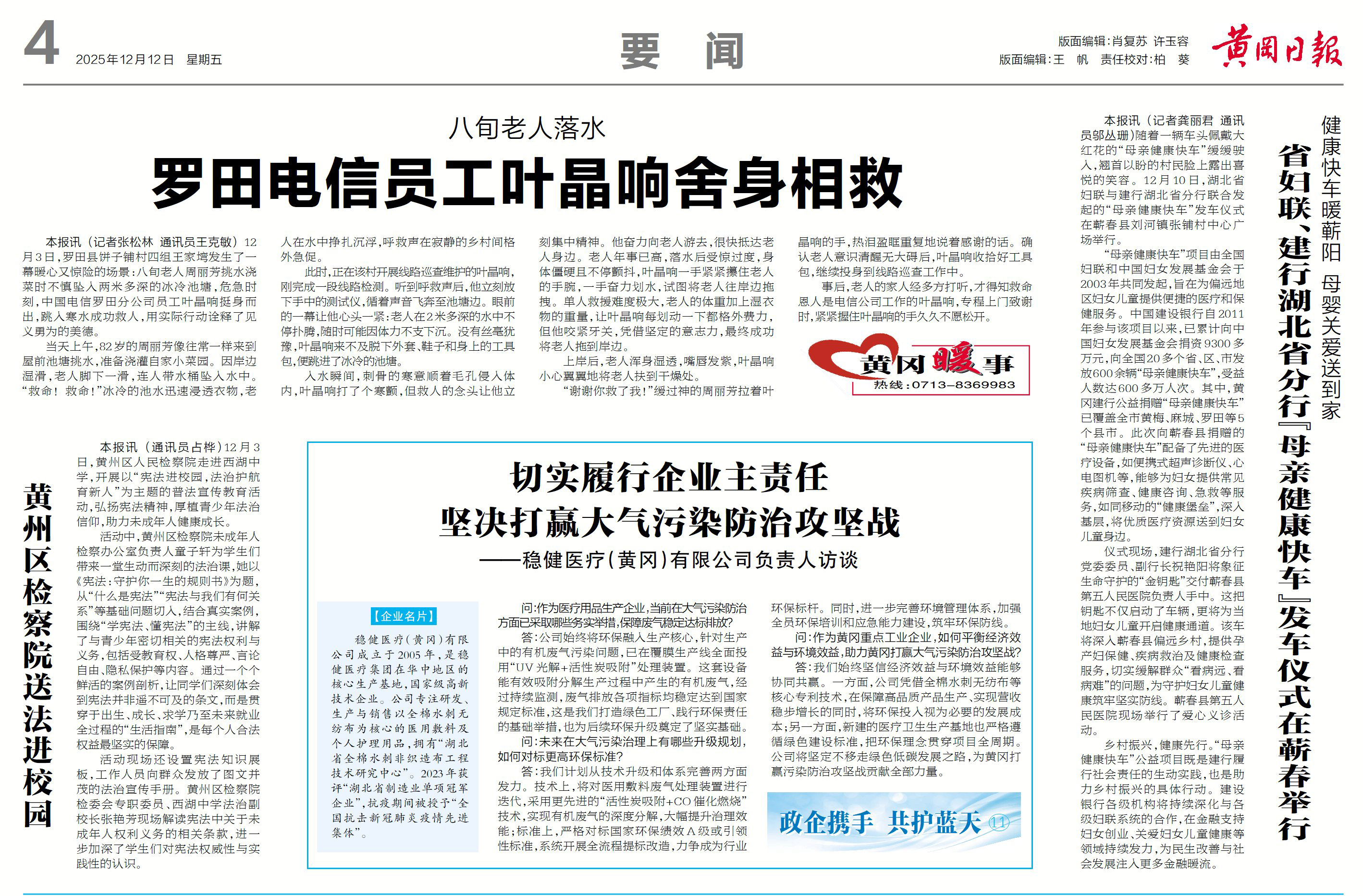 黄冈日报讯 (记者张松林 通讯员王克敏) 12月3日,黄冈市罗田县饼子铺村四组王家塆发生一幕暖心又惊险的场景:八旬老人周丽芳挑水浇菜时不慎坠入两米多深的池塘,危急时刻,中国电信罗田分公司员工叶晶响挺身而出,跳入刺骨的冷水中成功救人,用实际行动诠释了见义勇为的美德。