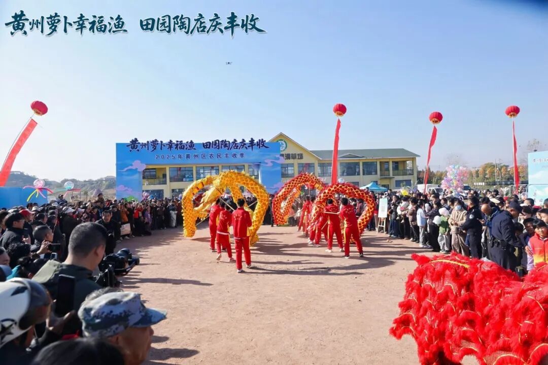 一大早,矫健的舞龙舞狮队伍以刚劲有力的舞姿拉开活动序幕。祥龙腾跃卷金浪,雄狮欢舞踏秋光,这翻腾的巨龙象征着黄州农业的蓬勃生机,欢跃的雄狮展现着黄州农民的精神风貌。
